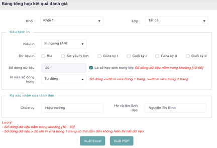 - Bước 3: Chọn Khối, Lớp và thông tin Cấu hình in, Ký xác nhận của lãnh đạo