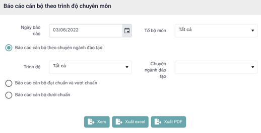 - Bước 3: Chọn Ngày báo cáo, Tổ bộ môn, Trình độ, Chuyên ngành đào tạo và tích chọn các checkbox phù hợp