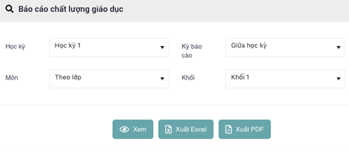 - Bước 3: Chọn Học kỳ, Kỳ báo cáo, Môn, Khối >> Nhấn xem