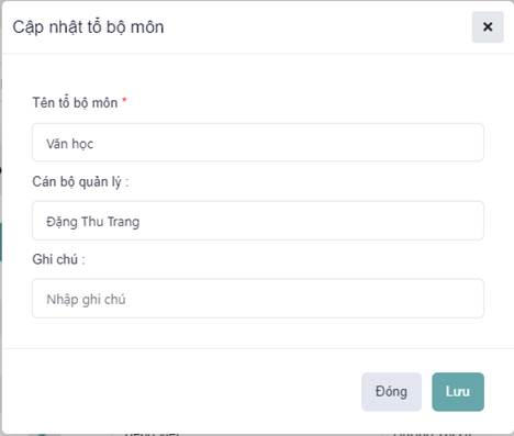 - Bước 3: Hiển thị màn hình Cập nhật tổ bộ môn, Nhập giá trị vào các trường