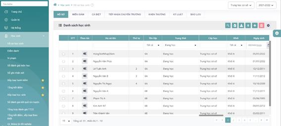 - Bước 1: Đăng nhập >> Chọn Menu “Học sinh” >> Chọn chức năng “Hồ sơ học sinh” >> Chọn tab “Hồ sơ” >> Hiển thị màn hình “Danh sách học sinh”