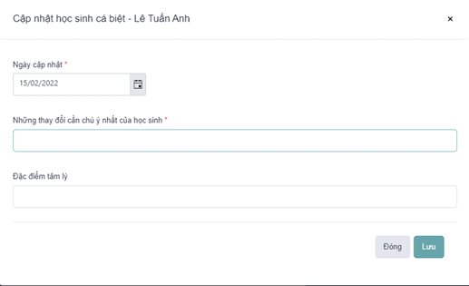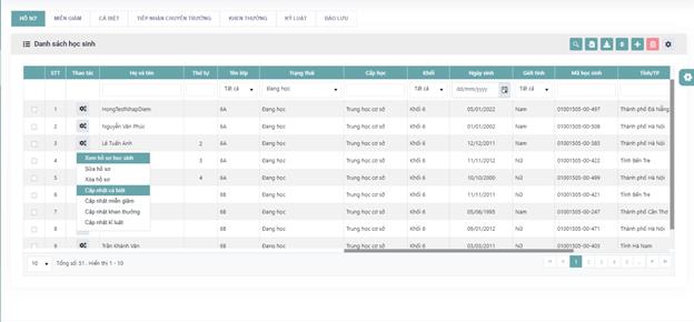 - Bước 2: Tại lưới danh sách học sinh - cột thao tác, kích chọn “Cập nhật cá biệt”