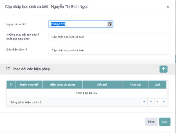 - Bước 3: Click vào tên học sinh ở lưới danh sách học sinh cá biệt • Hiển thị Pop up ‘Cập nhật học sinh cá biệt’