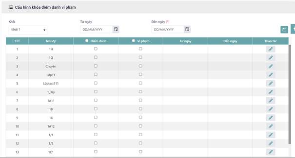 Bước 1 : Đăng nhập >> Vào menu “Hệ thống”>>Chọn menu “Cấu hình hệ thống”>> Chọn menu “Khóa điểm danh vi phạm” >> Hiển thị màn hình “Khóa điểm danh vi phạm”