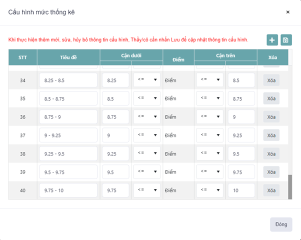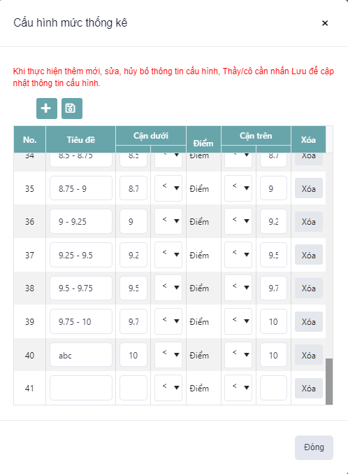 Lưu ý: NSD phải nhập đủ thông tin hợp lệ ở dòng thêm mới, cận dưới và cận trên nhập số trong khoảng tử 0 đến 10