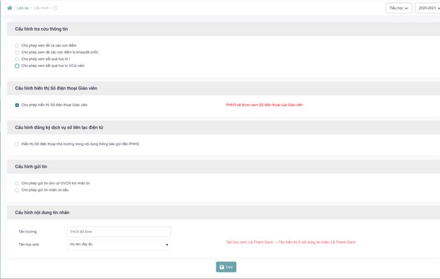 Bước 1 : Đăng nhập >> Vào menu “Liên lạc” >> Chọn “ Cấu hình” => Hiển thị màn hình “Cấu hình tra cứu thông tin”