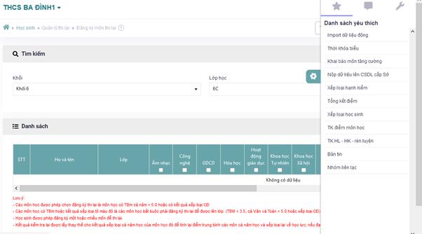 -      Bước 1: Đăng nhập >> Vào menu “Học sinh” >> Chọn “Quản lý thi lại”>> Đăng ký môn thi lại