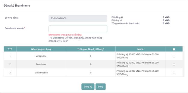 Bước 3: NSD thực hiện chọn thời gian đăng ký, loại nhà mạng áp dụng tại màn hình “ Đăng ký Brandname”.