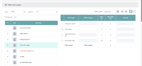 - Bước 4: Chọn Khối, Lớp và Tên học sinh cụ thể => Hiển thị màn hình Thêm mới vi phạm