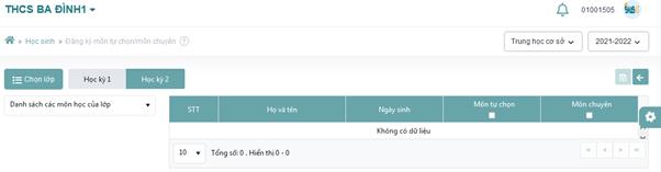 - Bước 2: Hiển thị màn hình ““Đăng ký môn tự chọn/ môn chuyên (thêm môn chuyên)”