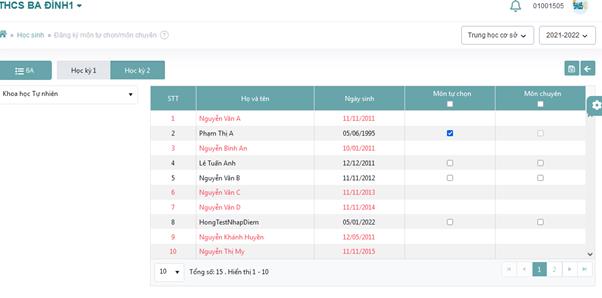 - Bước 4: Ở màn hình thêm mới chọn lớp, danh sách các môn học chọn môn học>> Môn tự chọn click vào học sinh muốn chọn