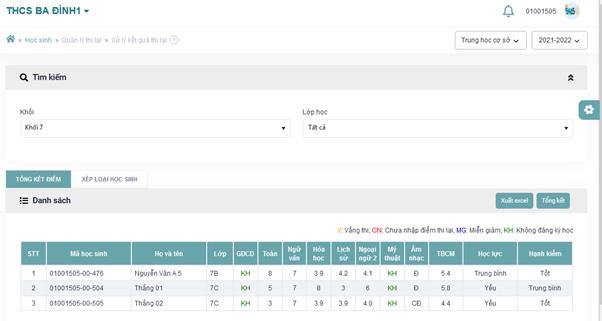 - Bước 1: Đăng nhập >> Vào menu “Học sinh” >> Chọn “Quản lý thi lại”>> Đăng ký môn thi lại