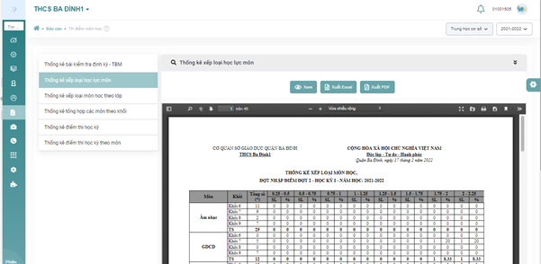 “Thống kê xếp loại học lực môn”