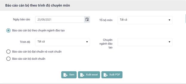 màn hình Xem thông tin Báo cáo cán bộ theo trình độ chuyên môn