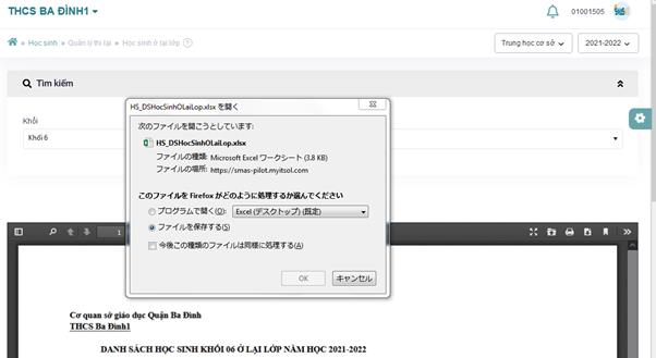 SMAS > Học sinh > Quản lý thi lại > Học sinh ở lại lớp > Chức năng xuất exel