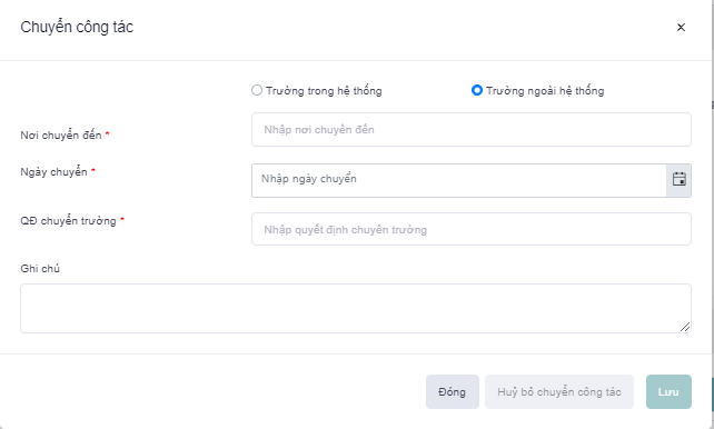 = > Sau khi chuyển công tác, hệ thống thay đổi trạng thái cán bộ thành “Chuyển công tác”