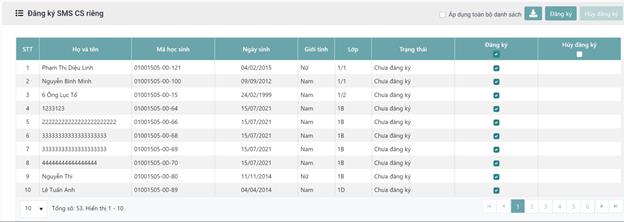 Bước 3: Tại danh sách Đăng ký SMS CS riêng, Tích chọn bản ghi muốn đăng ký tại cột “Đăng ký” của lưới danh sách, có thể chọn 1 hoặc nhiều hoặc tất cả bản ghi của từng trang bằng cách kích chọn tất cả hoặc tích chọn “ Áp dụng toàn bộ danh sách”.