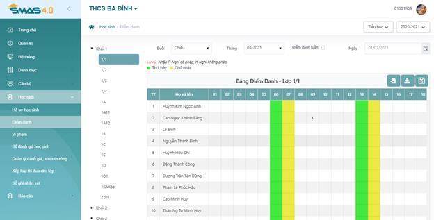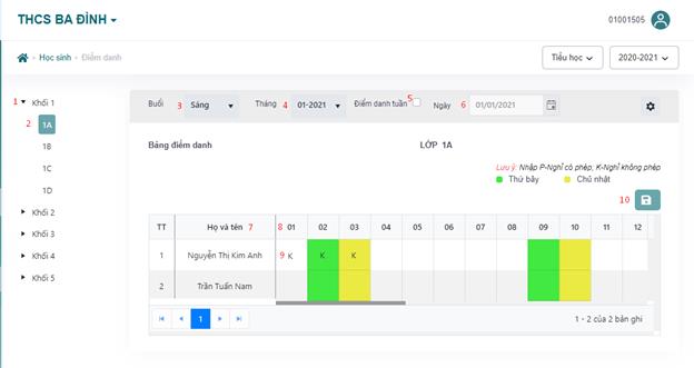 - Bước 6: Nhập P(Nghỉ có phép)hoặc K(nghỉ không phép) vào ngày tương ứng với học sinh muốn điểm danh
