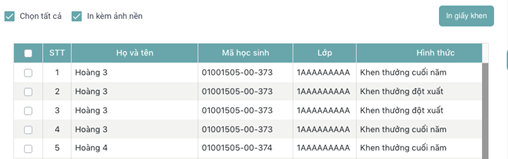 - Bước 4: Tích chọn học sinh cần in giấy khen, tích chọn In kèm ảnh nền