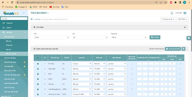 - Bước 1: Đăng nhập >> Vào menu “Hệ thống” >> Chọn menu ”Khai báo môn học cho lớp
