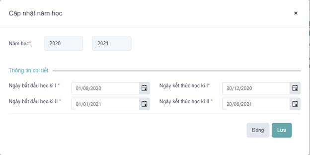 - Ngày bắt đầu học kì I đến ngày kết thúc học kỳ II phải nằm trong khoảng thời gian ngày bắt đầu đến ngày kết thúc của năm học đã được cấu hình trên hệ thống admin
