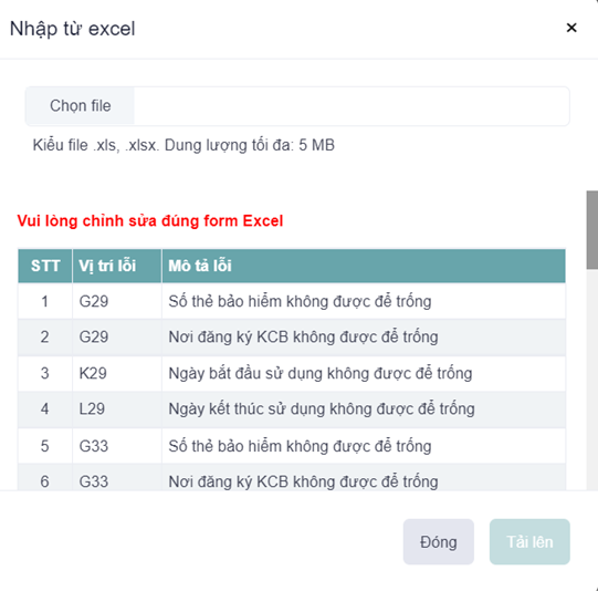 + File excel tải lên phải điền đầy đủ dữ liệu hợp lệ. Nếu NSD không điền đủ dữ liệu hợp lệ thì sẽ không thể tải dữ liệu từ file excel lên. Hệ thống hiển thị màn hình thông báo lỗi