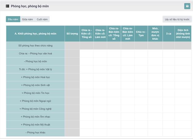 Bước 1 : Đăng nhập >> Vào menu “Cơ sở vật chất” >> Vào Chức năng “Quản lý CSVC”>> Chọn “ Phòng học, phòng bộ môn”. => Hiển thị màn hình