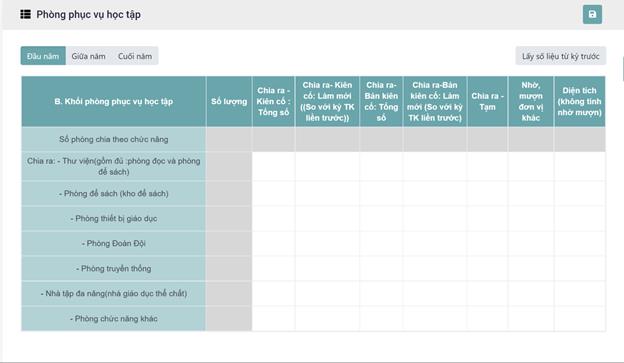 Bước 1 : Đăng nhập >> Vào menu “Cơ sở vật chất” >> Vào Chức năng “Quản lý CSVC”>> Chọn “ Phòng phục vụ học tập”. => Hiển thị màn hình