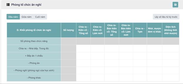 Bước 1 : Đăng nhập >> Vào menu “Cơ sở vật chất” >> Vào Chức năng “Quản lý CSVC”>> Chọn “ Phòng tổ chức ăn nghỉ”. => Hiển thị màn hình
