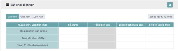 Bước 1 : Đăng nhập >> Vào menu “Cơ sở vật chất” >> Vào Chức năng “Quản lý CSVC”>> Chọn “ Sân chơi, diện tích”. => Hiển thị màn hình