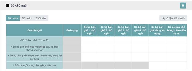 Bước 1 : Đăng nhập >> Vào menu “Cơ sở vật chất” >> Vào Chức năng “Quản lý CSVC”>> Chọn “ Số chỗ ngồi”. => Hiển thị màn hình
