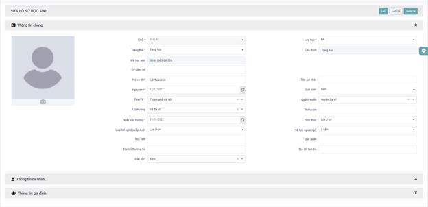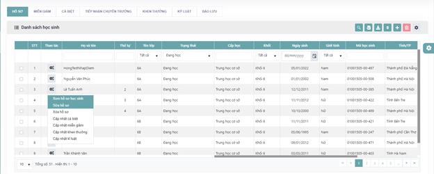Bước 2: Tại lưới danh sách học sinh - cột thao tác, kích chọn Sửa hồ sơ