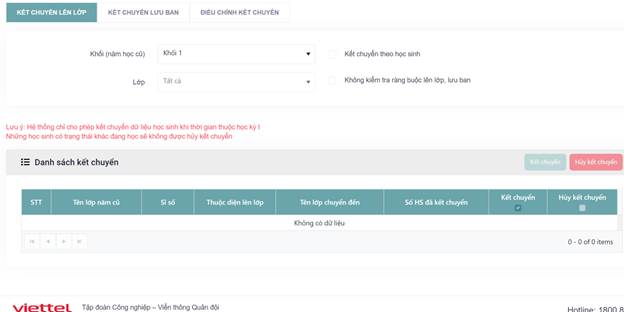 - Bước 1: Đăng nhập >> Vào menu “Hệ thống” >> Chọn menu “Kết chuyển dữ liệu”>> Chọn tab “Kết chuyển lên lớp”