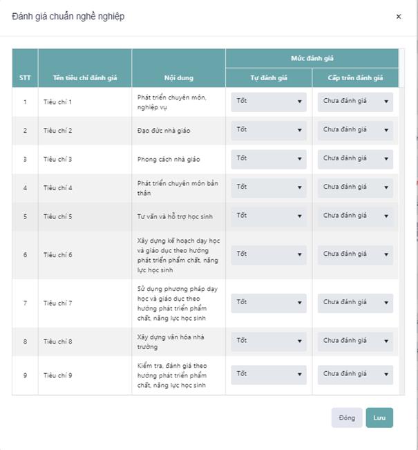 - Tự đánh giá, Cấp trên đánh giá không cho phép nhập, kết quả được lấy từ chức năng " Đánh giá chuẩn nghề nghiệp" theo năm học