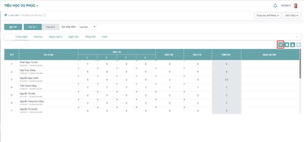 - Bước 2: Chọn Lớp học -> Chọn môn học -> Chọn học kỳ -> Hiển thị Danh sách điểm của học sinh