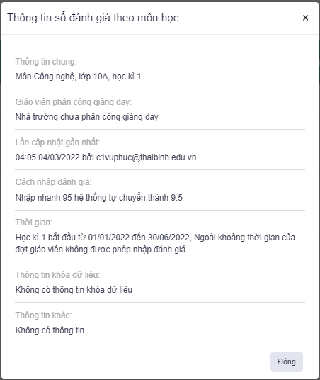 thông tin của sổ đánh giá môn học