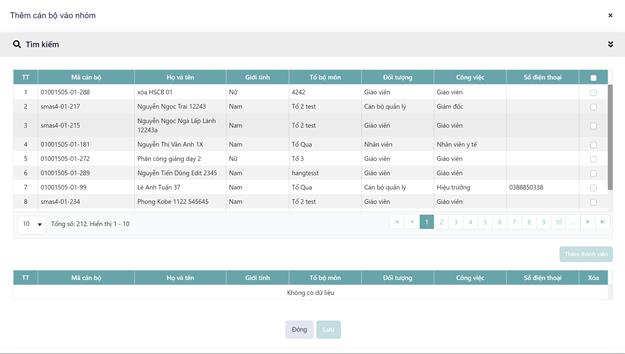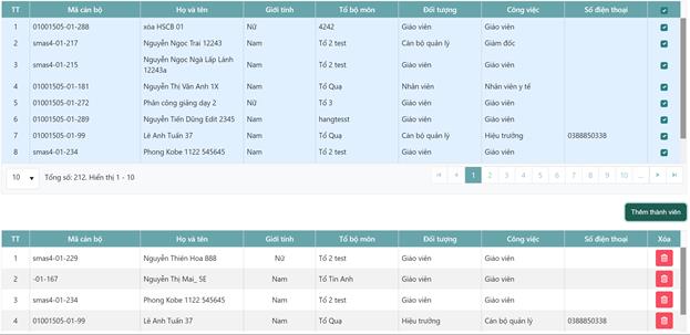 Bước 4: Tích chọn cán bộ muốn thêm tại cột cuối cùng của lưới danh sách, có thể chọn 1 hoặc nhiều hoặc tất cả bản ghi của từng trang bằng cách kích chọn tất cả.