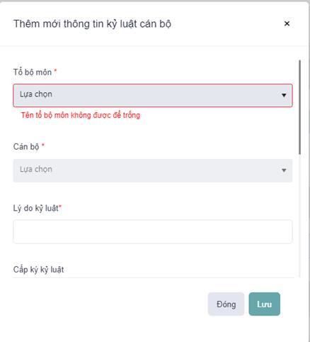 - Cán bộ: Chỉ cho phép chọn sau khi chọn Tổ bộ môn. Cán bộ load ra dựa trên tổ bộ môn