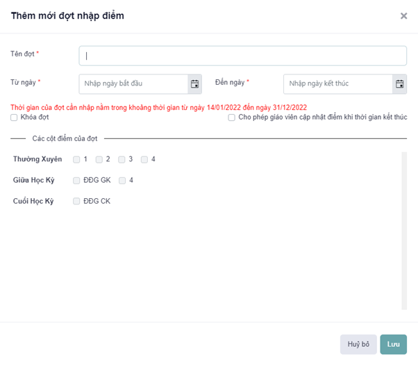 + Thông tin Từ ngày, Đến ngày không được trùng với thời gian của đợt nhập điểm khác đã khai báo trước đó