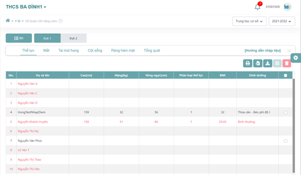 - Các học sinh được đánh dấu màu đỏ là học sinh hiện tại không học trong lớp đó, NSD không thể nhập các thông tin sức khoẻ đối với những học sinh đó