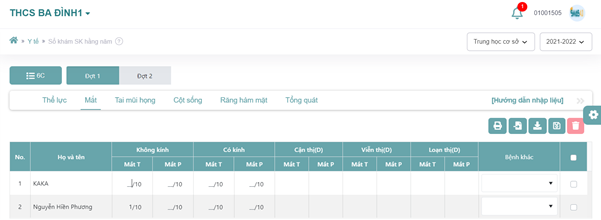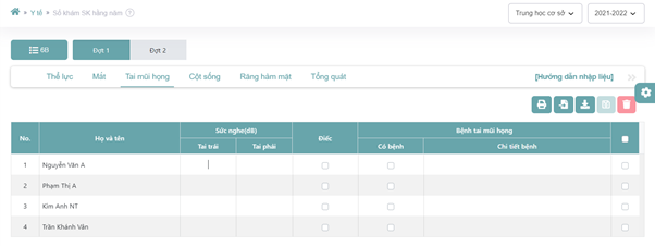 + Bệnh tai mũi họng - Có bệnh: Kích chuột vào ô nếu học sinh đó có bệnh về tai mũi họng