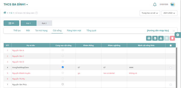 + Cong vẹo cột sống: Kích chuột vào ô nếu học sinh đó bị cong vẹo cột sống
