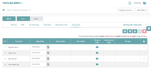 + Đánh giá sức khoẻ: Nhập theo hướng dẫn nhập liệu