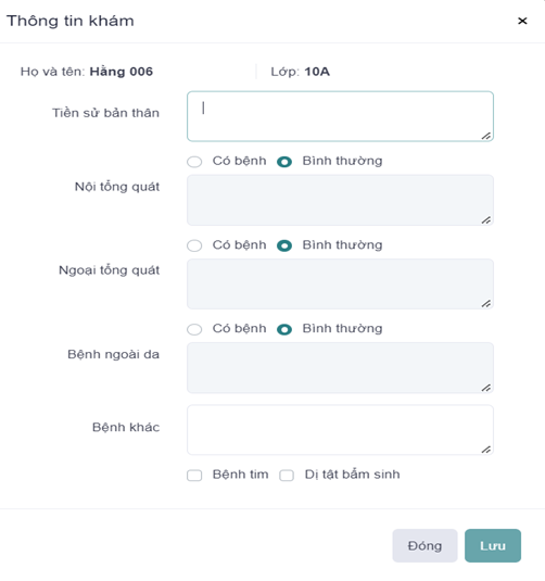 - Thông tin [Ngày khám] cần thuộc ngày trong năm học hiện tại. Nếu NSD nhập [Ngày khám] không thuộc ngày trong năm học hiện tại thì hệ thống sẽ tự động lưu thông tin ngày khám là ngày hiện tại