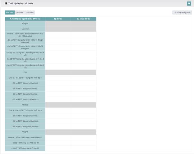 Bước 1 : Đăng nhập >> Vào menu “Cơ sở vật chất” >> Vào Chức năng “Quản lý CSVC”>> Chọn “ Thiết bị dạy học tối thiểu”. => Hiển thị màn hình