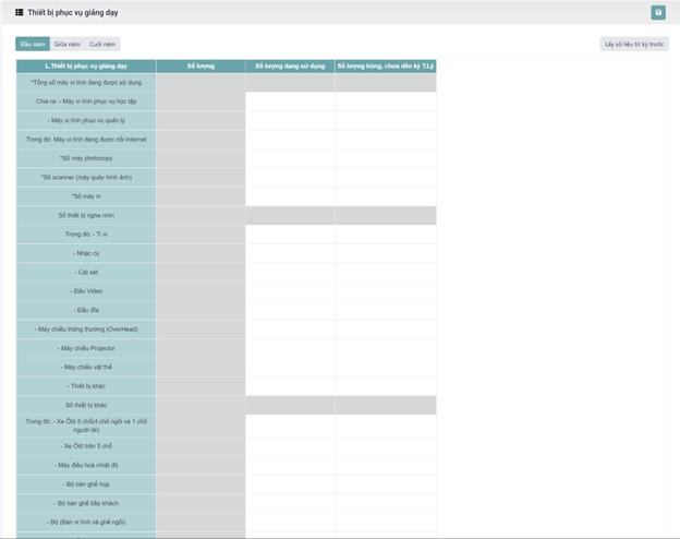 Bước 1 : Đăng nhập >> Vào menu “Cơ sở vật chất” >> Vào Chức năng “Quản lý CSVC”>> Chọn “ Thiết bị phục vụ giảng dạy”. => Hiển thị màn hình