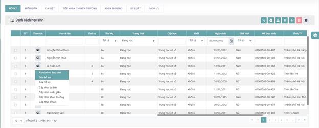 - Bước 2: Tại lưới danh sách học sinh - cột thao tác, kích chọn “Sửa hồ sơ”