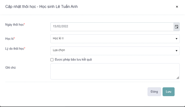- Bước 4: Hiển thị màn hình Cập nhật thôi học >> Nhập thông tin vào các trường