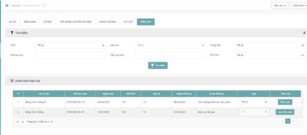 - Bước 2: Tại học sinh cần tiếp nhận bảo lưu, chọn Lớp tiếp nhận >> Click Tiếp nhận
