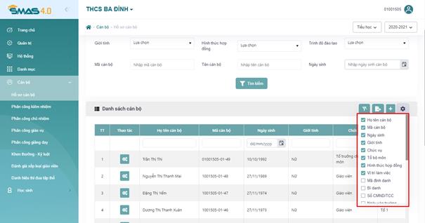 - Bước 5: Tích/bỏ tích chọn để hiển thị/ ẩn các cột trên danh sách Cán bộ